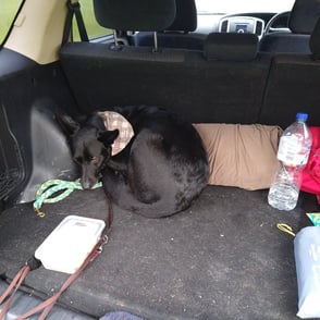 Sousa had his 2 litre water, his bowl, a toy, comfy blanket and poop bags in his.